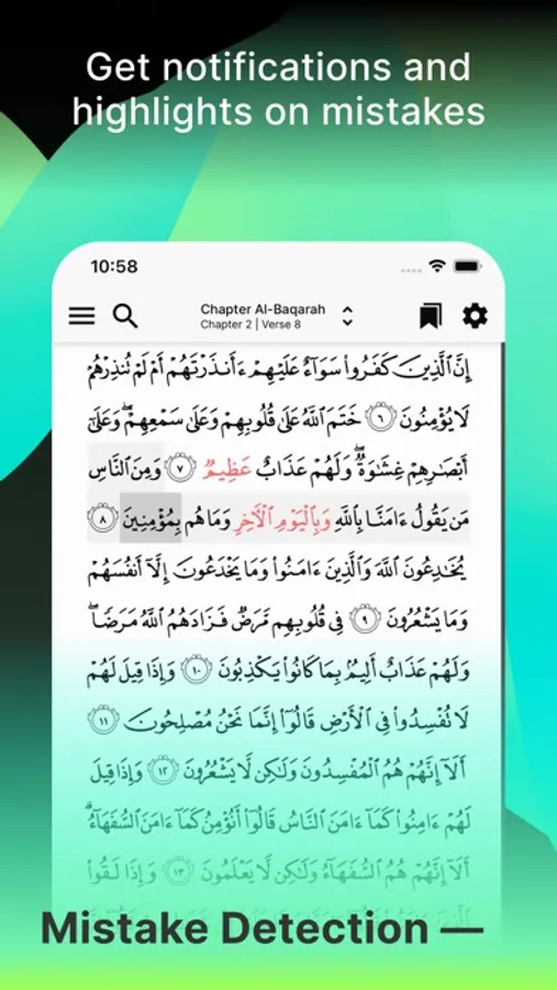 Start reciting and you’ll be notified whenever you miss a word, use the wrong word or say one word too many! Tarteel will highlight your mistakes and keep track so you can revise and review for next time. Currently, this feature does not include Tajweed or pronunciation correction, but we are working towards incorporating them into Tarteel in due course.