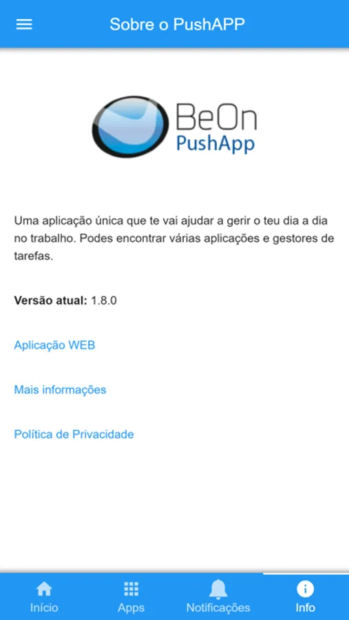A aplicação PushAPP In permite o acesso a recursos dirigidos aos clientes, colaboradores ou parceiros, promovendo uma comunicação mais rápida e direta entre pessoas e departamentos de forma a agilizar processos e tornar o acesso à informação mais fácil.