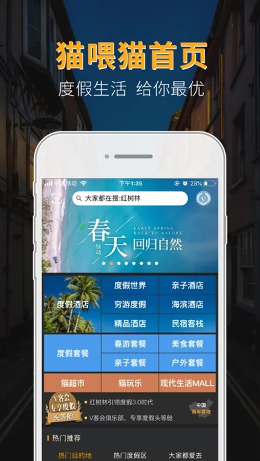 猫喂猫MVM云平台,致力于提供全球“一价全包”度假生活服务的平台,颠覆传统平台仅以酒店、票务为主的产品模式;第一个提供“主题游”搜索引擎的平台,通过亲子、美食等不同主题搜索即刻获得一系列相关度假服务;也是房车主寻找房车营地、房车酒店的指南。