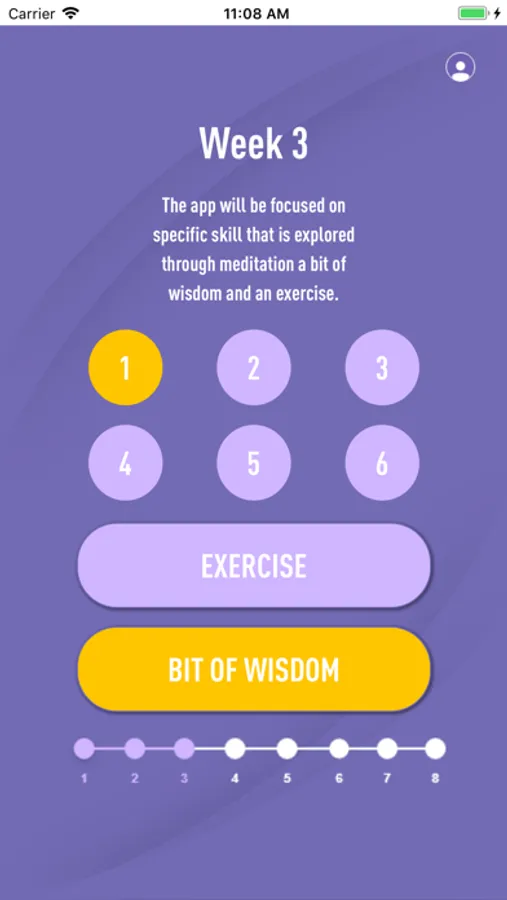 The app has three main sessions: meditation, a bit of wisdom and an exercise and 8 week cycle. The app is demonstrated through an INTRO where we welcome the users explaining to them why the app has been created and how it works. In the middle and at the end, a self-assessment section is aimed at checking the progress in the meditation practice.