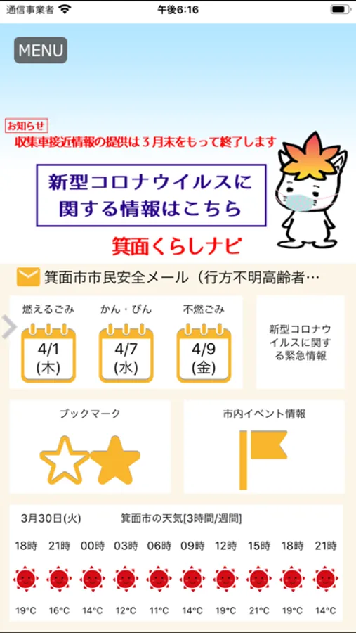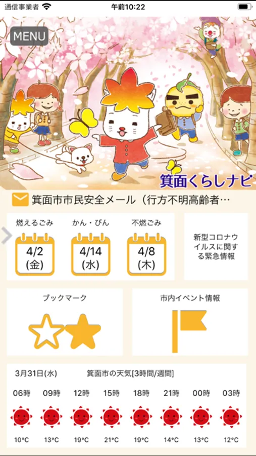 「箕面くらしナビ」は、箕面市にお住まいの方を対象とした総合アプリです。