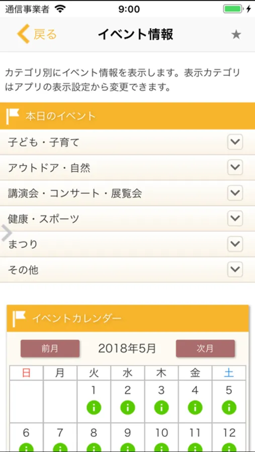 箕面市内のイベント開催情報を確認することができます。表示させるイベントのカテゴリを選択することもできます。