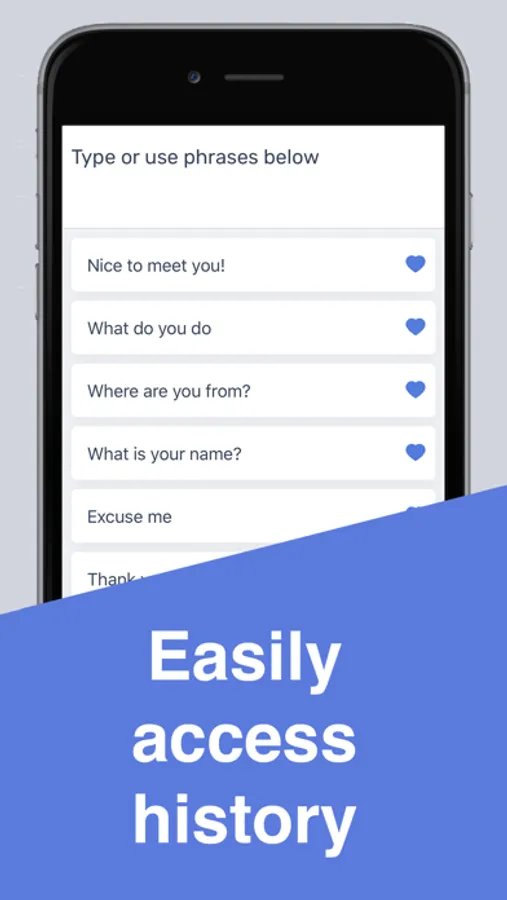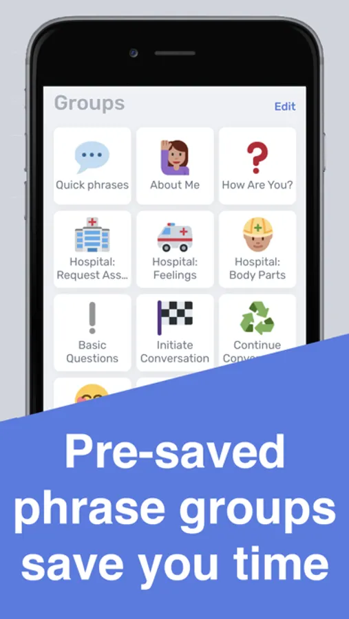 AAC Communicator contains a growing list of basic pre-programmed phrases such “How are you?” which speed up communication. In addition, recent phrases are easily accessible should a user need to repeat something they have said. Additional phrases can also be saved to Favorites by the user for easy access.