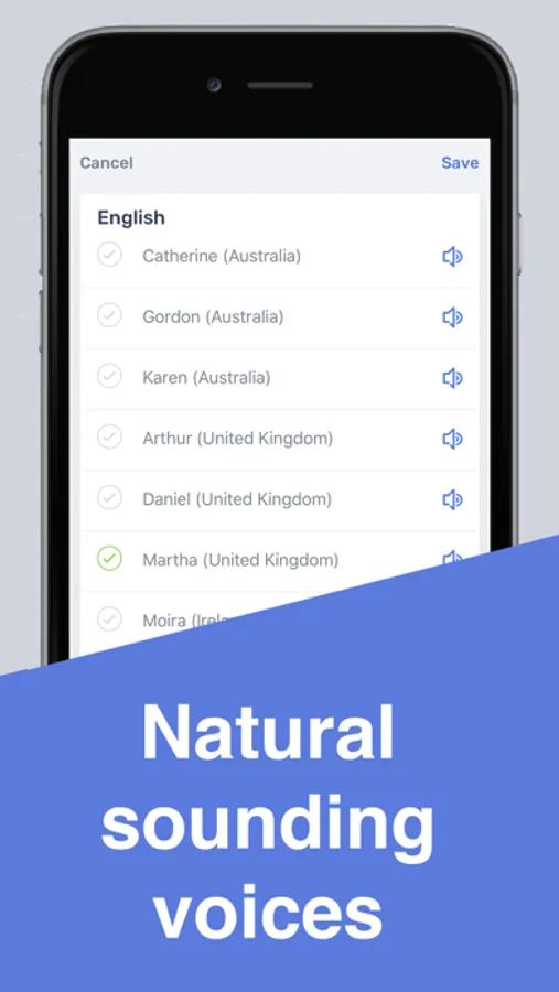 Note additional voices on your device may need to be enabled in Settings. If so, you can do so in Settings → General → Accessibility → Speech → Voices.