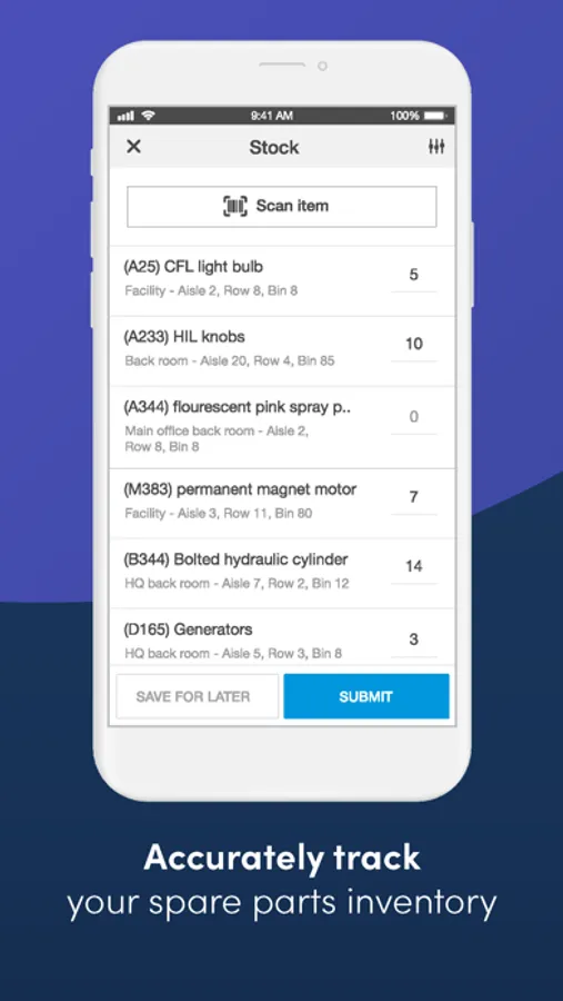 - Spare parts inventory tracking: Keep track of spare parts inventory and quickly associate needed spare parts with a work order.
