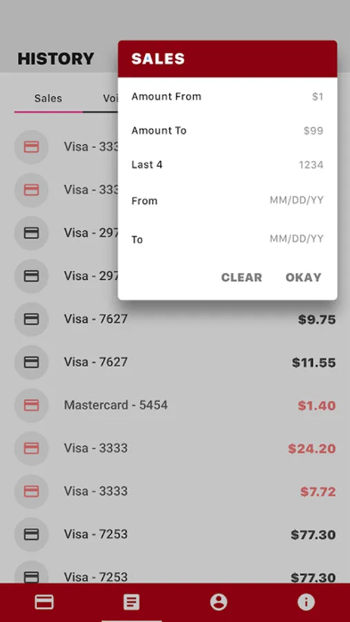 You can track all sales activities within the app: approved transactions, declined, reasons for the declined, and historical transaction activity and quickly enabled you to refund or void transactions.