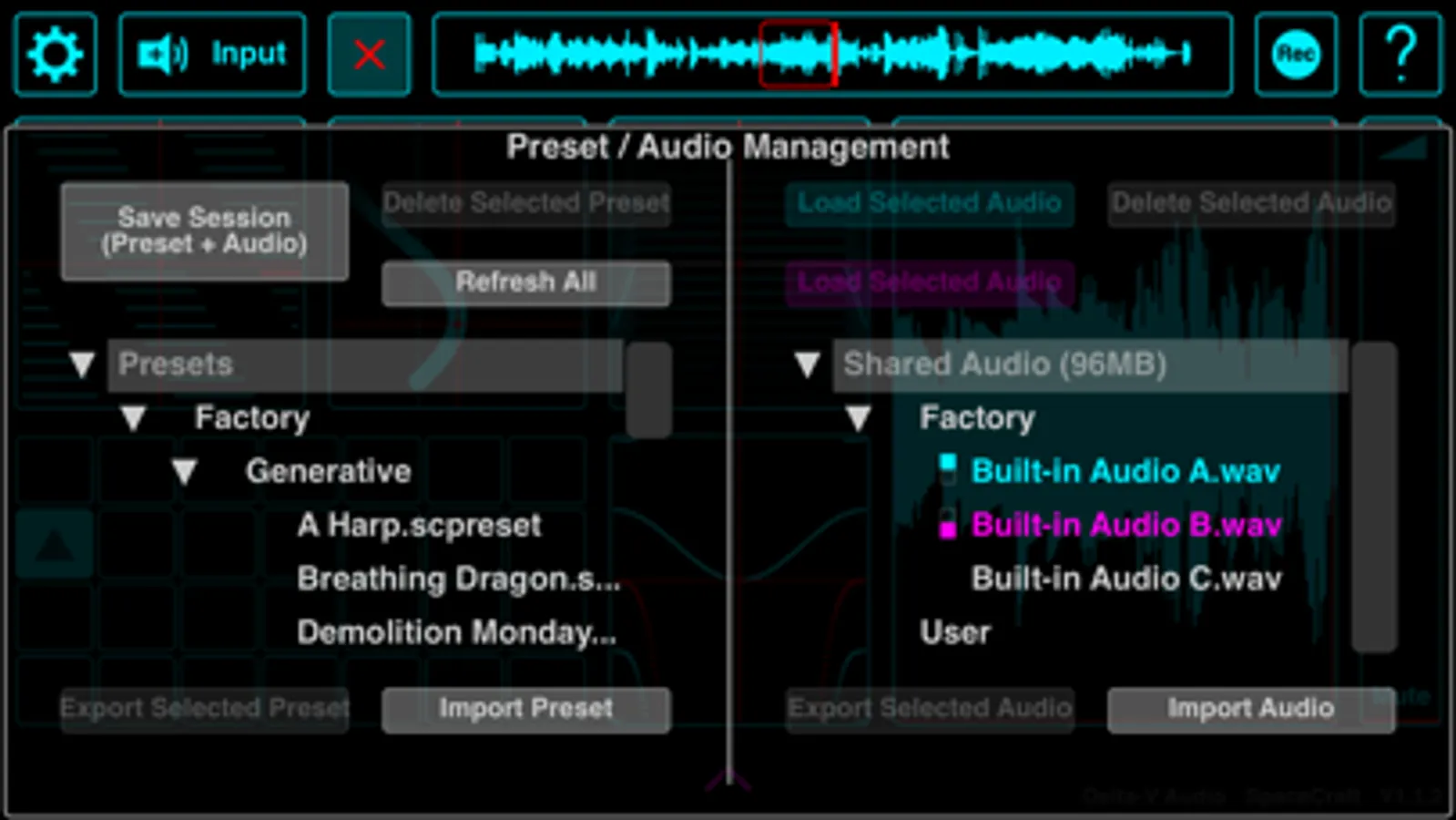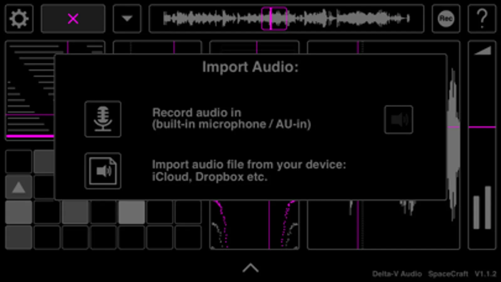 Tap the 'Input' button (top left) to record audio via your device's microphone or load a file from your device (access* to iCloud, Dropbox, Google Drive, Audioshare*** etc.). Experiment with turning everyday sounds into unusual instruments.
