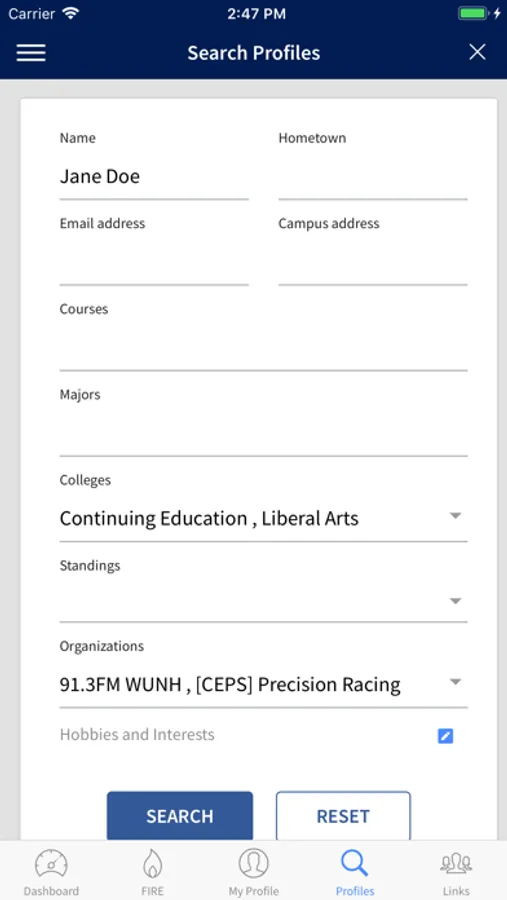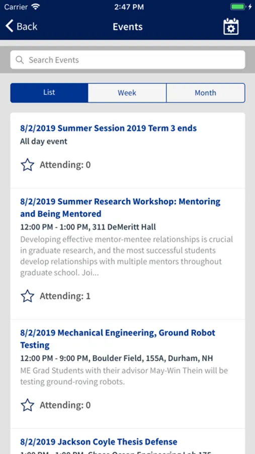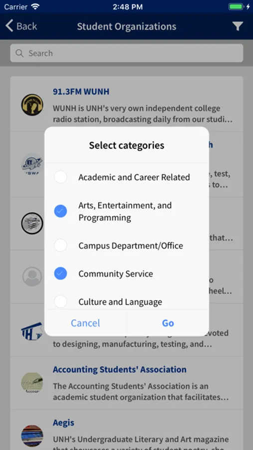 Log into the app using your UNH credentials to update your profile, search other student profiles and see suggested connections. Search for organizations that suit your interests, whether you want to play a club sport, connect with other cultures or march in a band.
