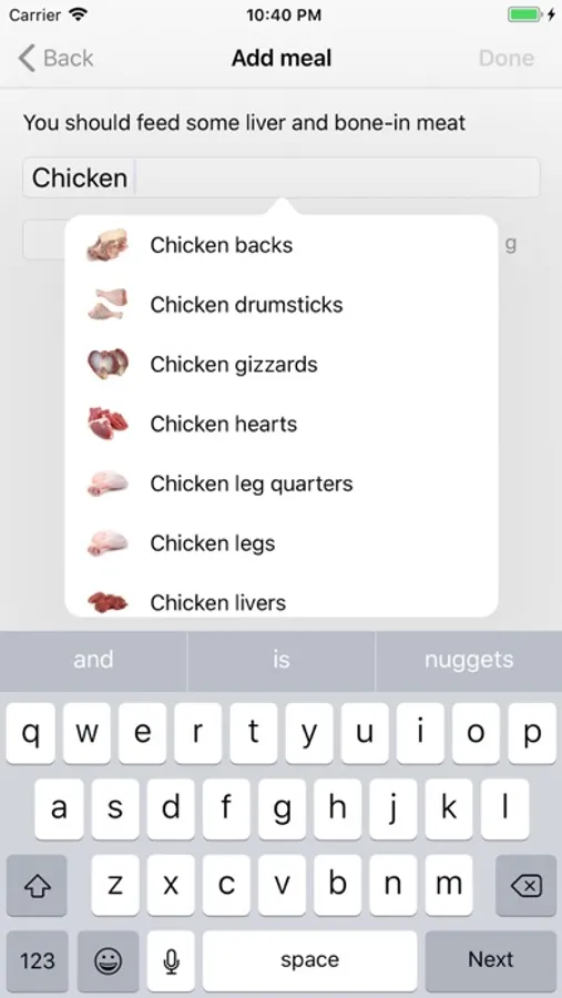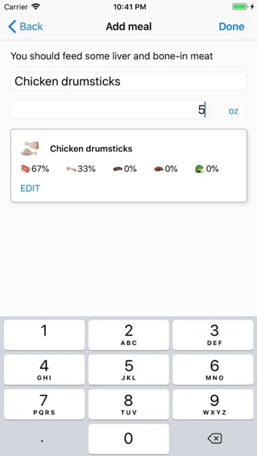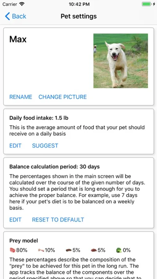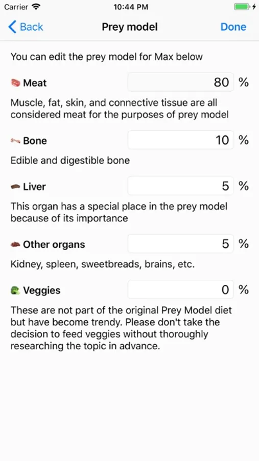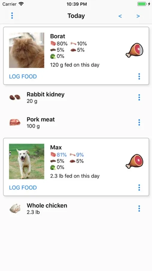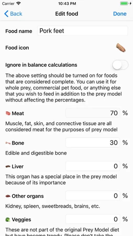Essentially, the app is a food logger. It will simplify balancing your pet's diet by tracking the percentages and recommending what you should feed in order to get them where they should be. Thus, you can skip making complicated feeding plans. You can feed whatever you have available in the fridge now and balance it out another day. The app will help you achieve balance over the course of a customizable period of time. It will also automatically suggest a smaller meal size for the day if you have overfed recently, and a larger one if you have underfed. The goal percentages and the average daily intake can be customized for each individual pet. For example, you may wish to decrease the bone percentage for your cat, as many raw feeders do, but keep your dog to the default 10%. Although the most popular raw foods are predefined in the app, you are free to edit them or add new ones.