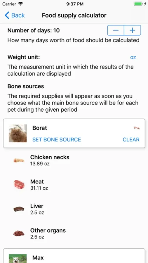 In order to help you with shopping, the app also features a Food Supply Calculator that tells you how much food will be needed by your pets for a given number of days.