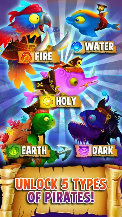 Unlock 5 types of pirates: Fire, Water, Earth, Dark, and Holy