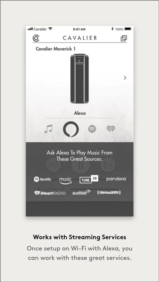 The Cavalier app is designed to work with our line of smart speaker solutions with refined craftsmanship, authentic materials and immersive sound with style that sets you apart from the ordinary. The app is used to: