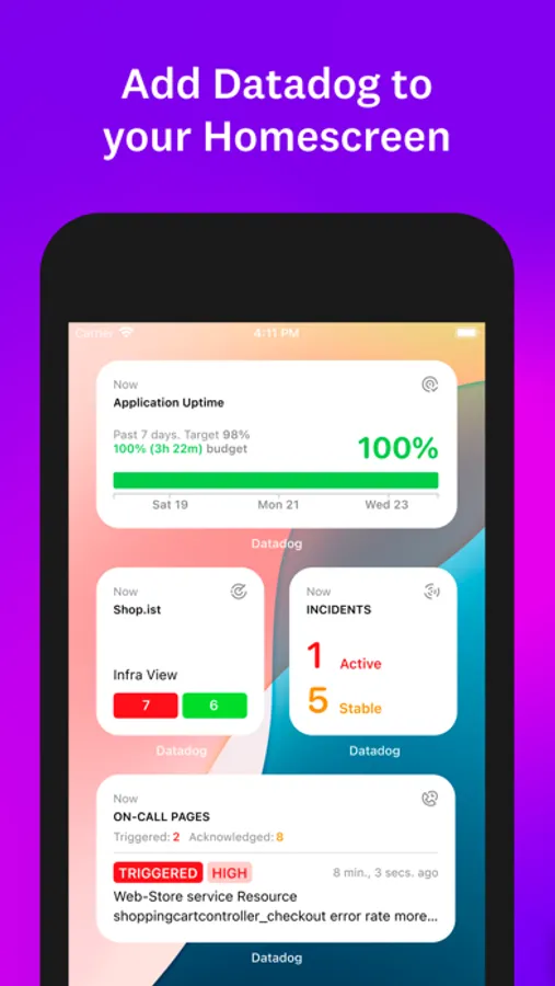Add Datadog to your Home or Lock Screen for one-tap access to critical metrics and monitors.