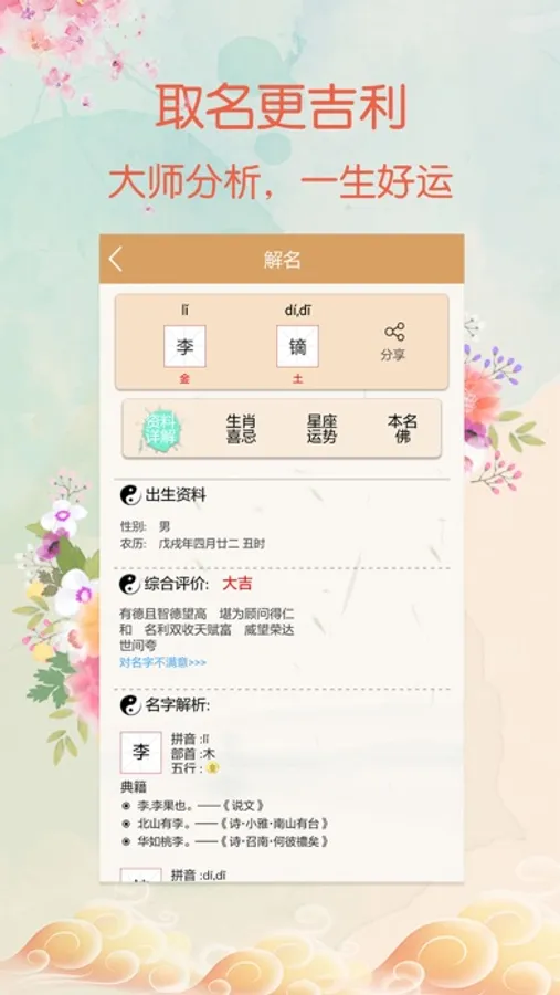 2.[姓名解析]一键查询您的姓名拼音、笔画、五行、吉凶、五格等命理释义参考,通过姓名学原理各方面分析评分。