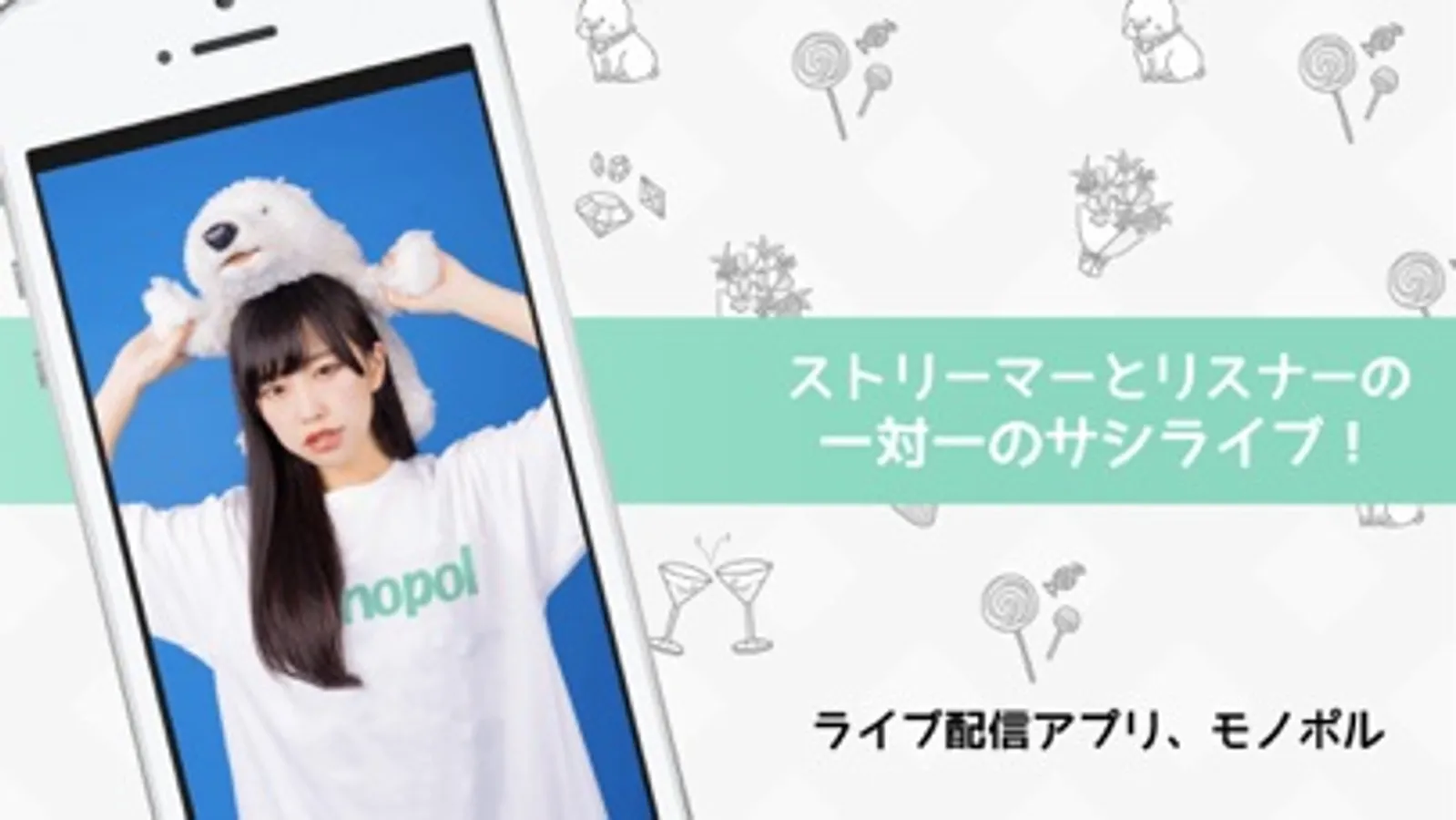 Monopol(モノポル)は、スマホ1台あればいつでも誰でも気軽に一対一(サシ)で男性も女性も気軽にライブ配信が出来るアプリです。初心者の方は勿論、アイドル、モデル、女優などの有名人たちも多数サシライブ中です!