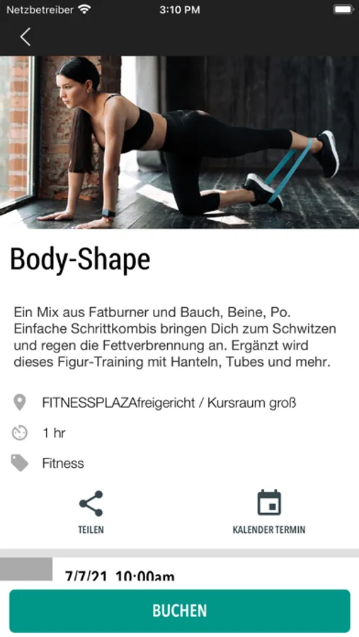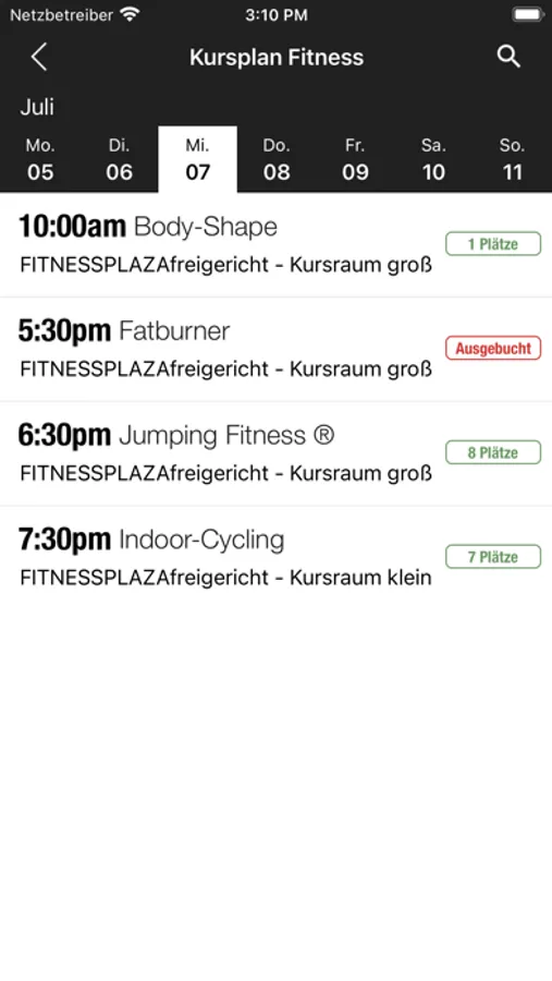 Direkter und aktueller Zugriff auf den Kursplan von überall: Für jeden Kurs kannst Du Details wie Zeit, Kursbeschreibung, Raum und Merkmale wie z.B. den Schwierigkeitsgrad einsehen.