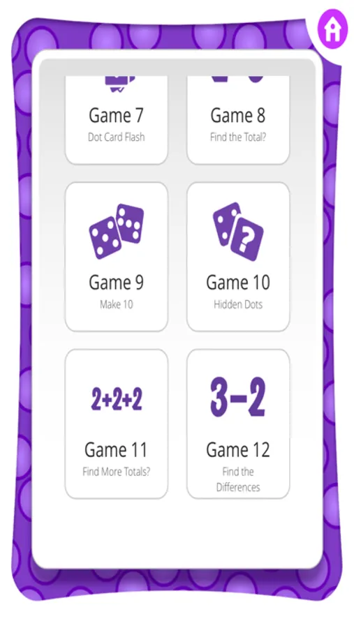 There are 12 games using visual dots and dot cards. The games cover the following skills: