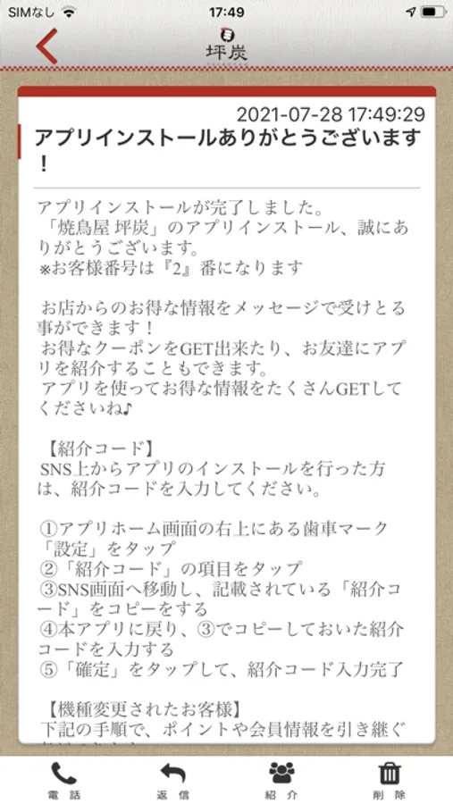 焼鳥屋 坪炭のアプリをSNSを通じてお友達に紹介する事ができます。