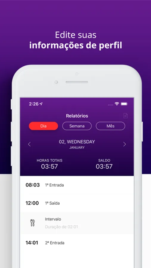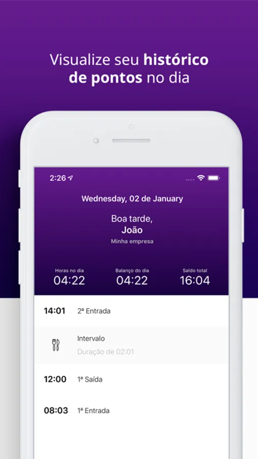 É possível também navegar pelos registros de pontos diariamente, semanalmente e mensalmente em poucos toques, visualizando as horas trabalhadas e saldo de horas por período.