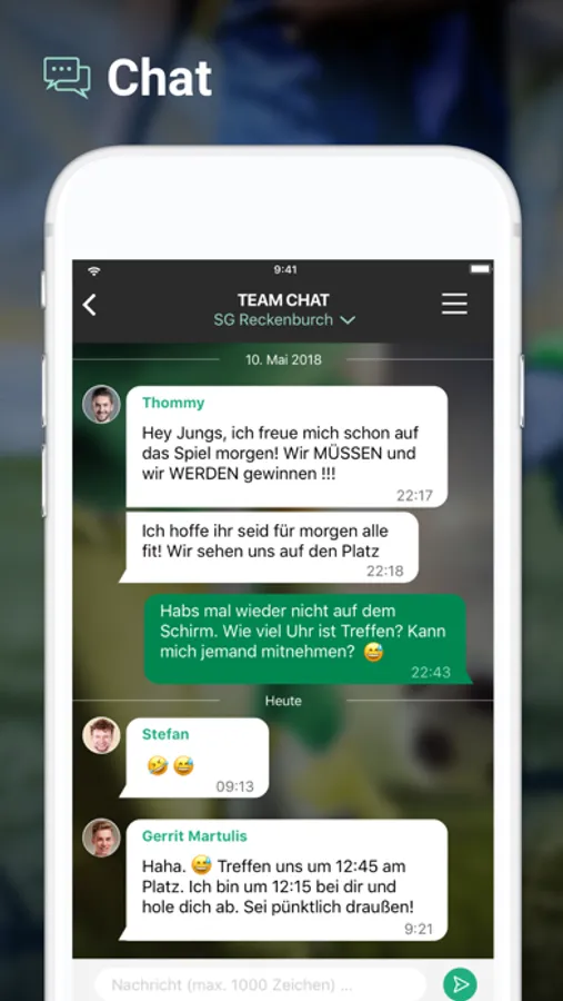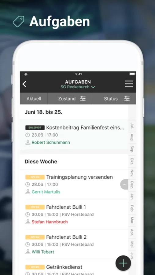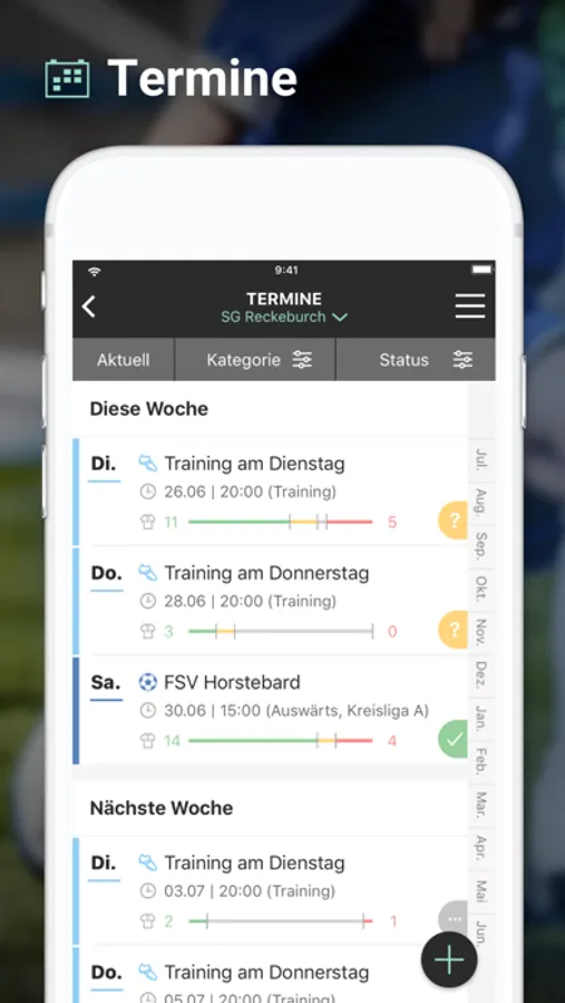 Alle im DFBnet geplanten Spiele werden in der App angezeigt und automatisch aktualisiert. Zusätzlich können aber noch individuelle Termine wie Trainingszeiten, Teamsitzung oder die Abschlusstour eingegeben werden. Aller Termine können von den Teammitgliedern ab- und zugesagt und mit dem persönlichen Kalender synchronisiert werden.