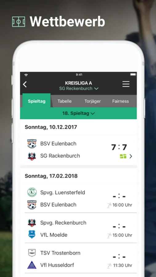 Durch die Verknüpfung zu FUSSBALL.DE werden alle Wettbewerbe des Teams automatisch in TEAMPUNKT angezeigt. Alle Infos zu Staffeln und Spielen, Tabellen und Statistiken können jederzeit abgefragt werden.