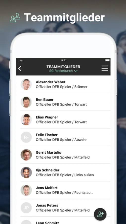 Alle im DFBnet für das Team gemeldeten Spieler werden in der App angezeigt und können ganz einfach per Whatsapp, Mail oder SMS eingeladen werden. Weitere Spieler und Betreuer können hinzugefügt werden.