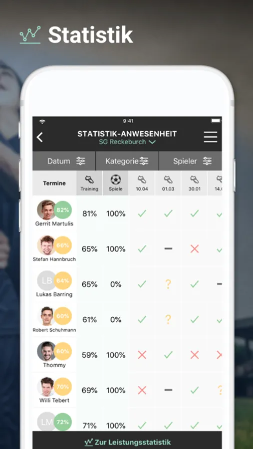 Trainer können alle Daten und Informationen zu ihren Spielern einsehen und verwalten. Sie haben einen direkten Überblick über die Verfügbarkeit der Spieler, übernommene Aufgaben auch Anwesenheits- und die Leistungsstatistiken jedes einzelnen Teammitglieds sieht der Trainer auf einen Blick.