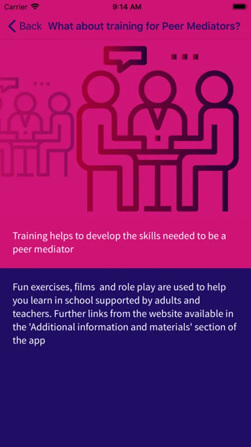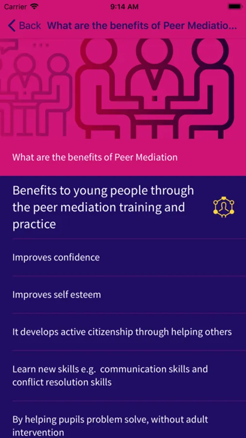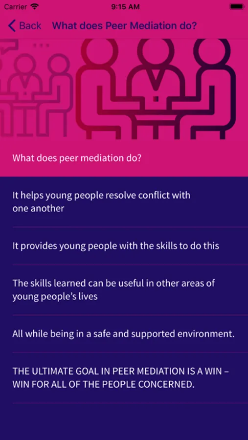 The app supports peer mediation with a clear structure and information for young people and adults following training.