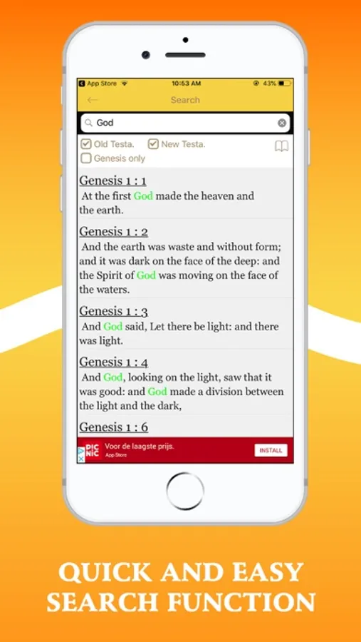 Type any word you want to find in the bible and this feature will quickly bring up something that is related to the search term. It can be the full word or parts of it. The intelligent search will find it for you.