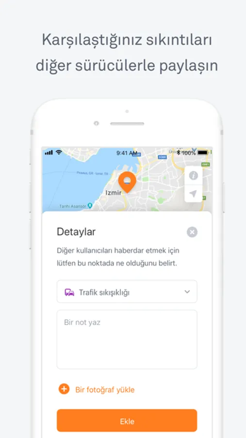 Kullanıcılar ve ekibimiz tarafından harita üzerine eklenen pinlere bakarak anlık trafik bilgisini öğrenebilir veya yeni bir pin ekleyerek diğer insanlara lokasyon hakkında bilgi vererek yardımcı olabilirsin.