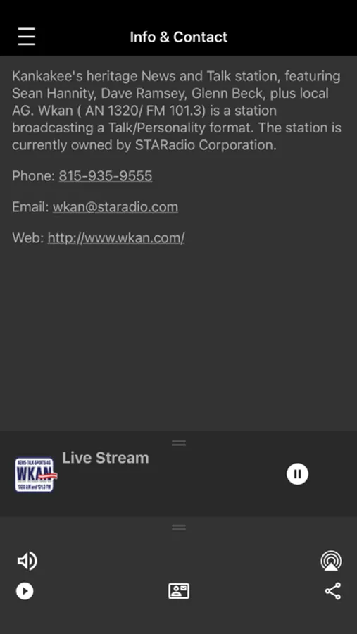 Kankakee's heritage News and Talk station, featuring Sean Hannity, Dave Ramsey, Glenn Beck, plus local AG. WKAN ( AM 1320/ FM 101.3) is a station broadcasting a Talk/Personality format. The station is currently owned by STARadio Corporation.
