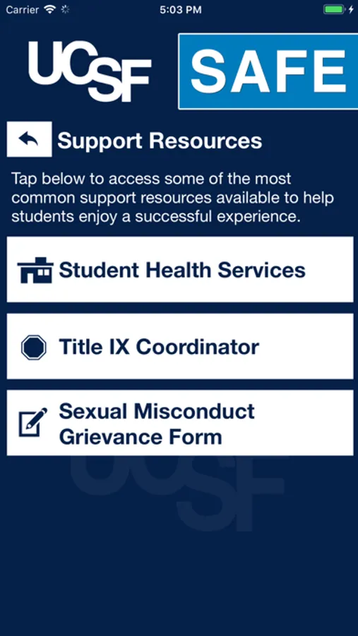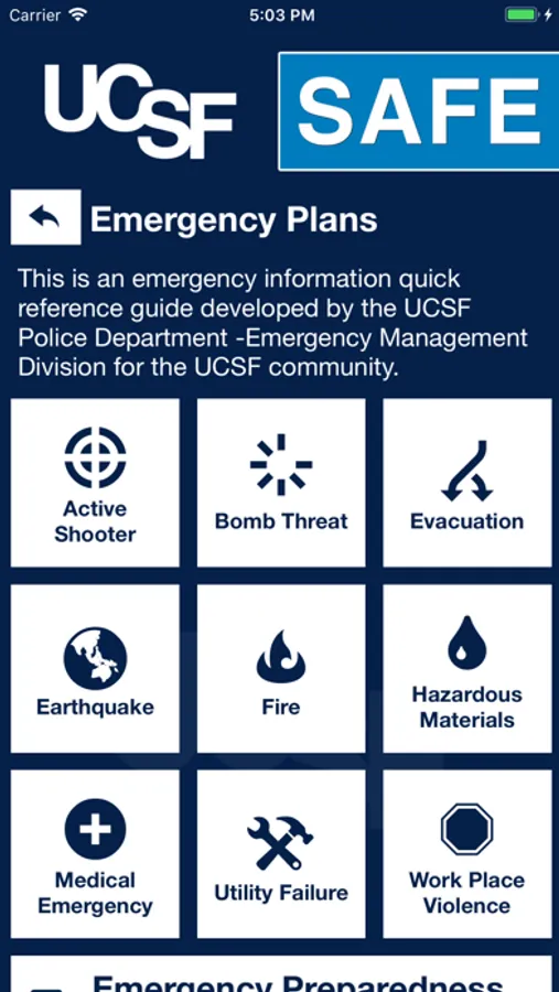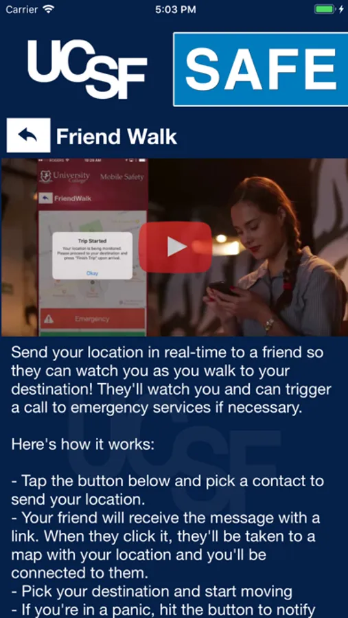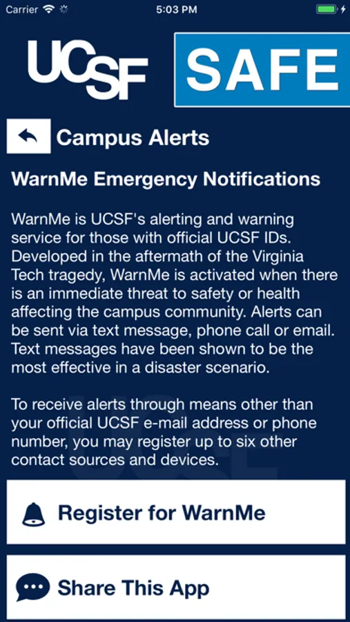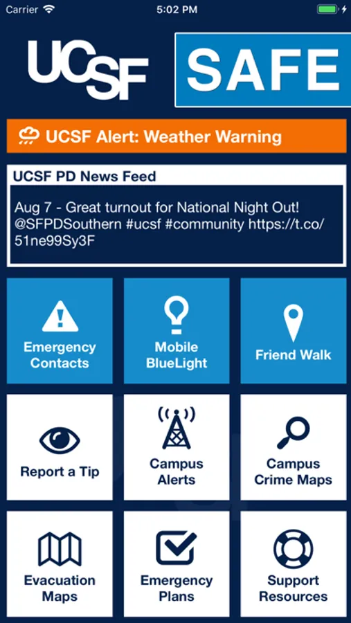 UCSF Safe is the official safety app of University of California San Francisco. It is the only app that integrates with UCSF's safety and security systems. Emergency Management Division has worked to develop a unique app that provides students, faculty and staff with added safety on the UCSF campus. The app will send you important safety alerts and provide instant access to campus safety resources.