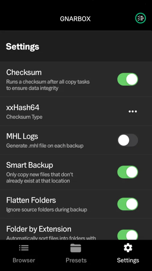 • Backups with xxHash64 or MD5 Checksum Verification: Secure your files to and from memory cards, storage drives, or your GNARBOX internal SSD with an easy-to-use interface. Checksum verifications that give you the assurance of successful file transfers.