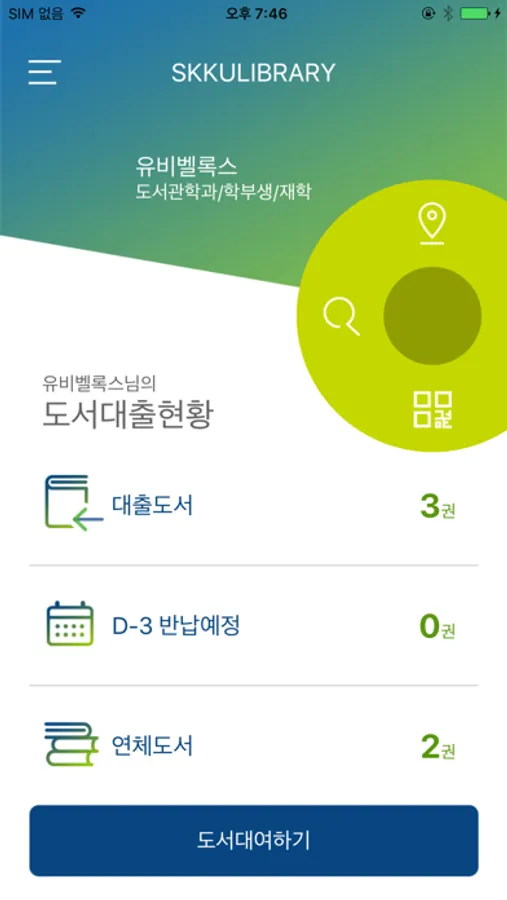 1. 홈 : 대출도서, D-3반납예정도서, 연체도서의 현황을 조회할 수 있으며, 도서 검색, 대여를 할 수 있습니다.