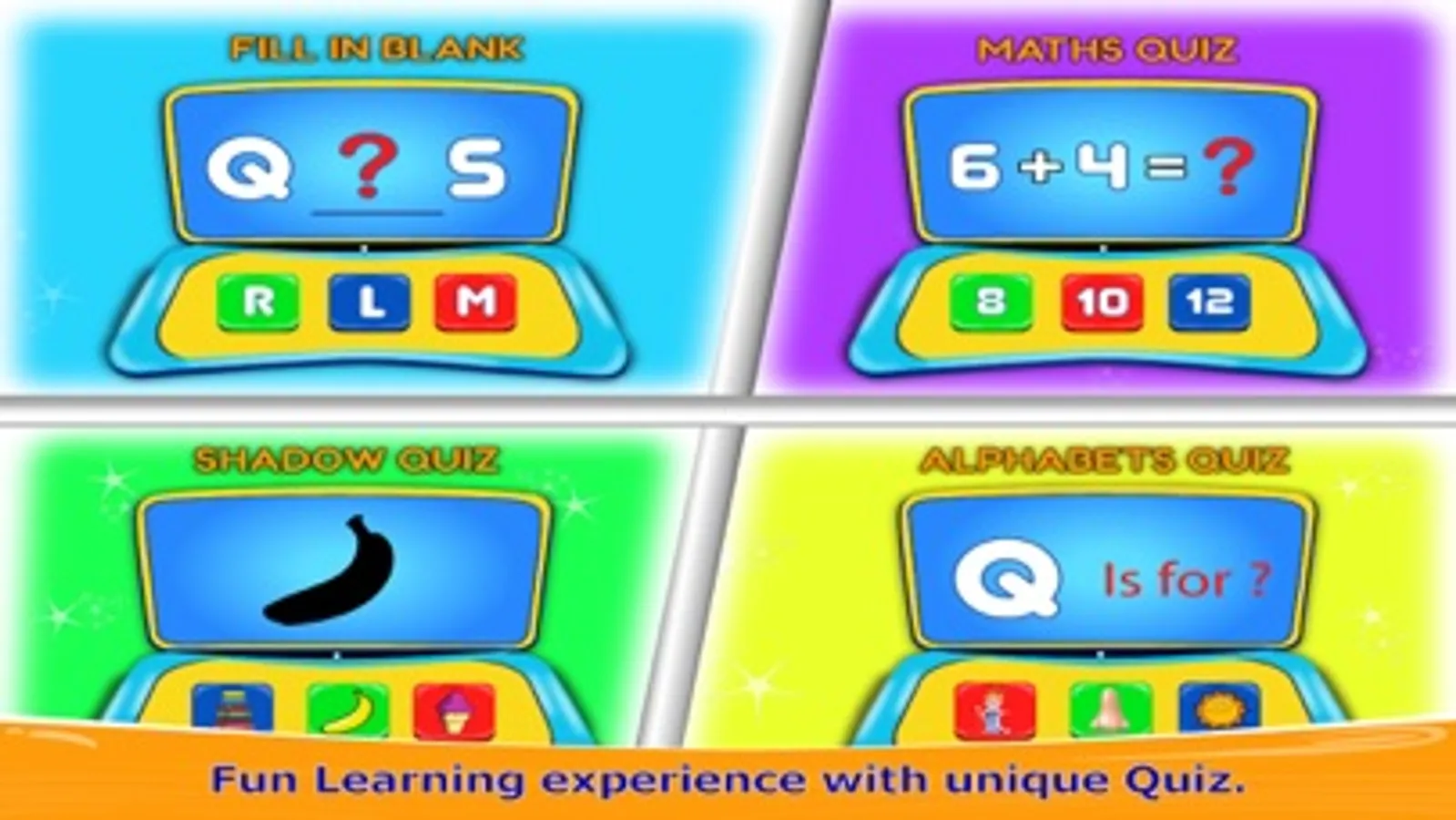 Preschool computer quiz game is divided in two parts.First is learning phase which helps in identify different things and second is Quiz which ask question about maths, shadow match, alphabets and fill in blanks.