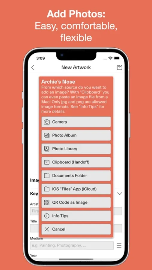 – Add pictures via camera, photo album, documents folder, clipboard.