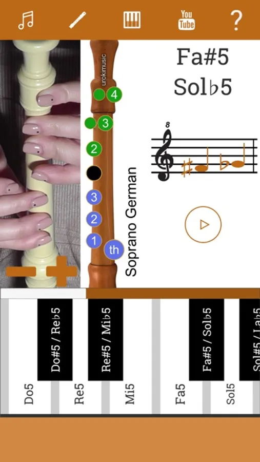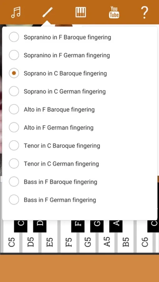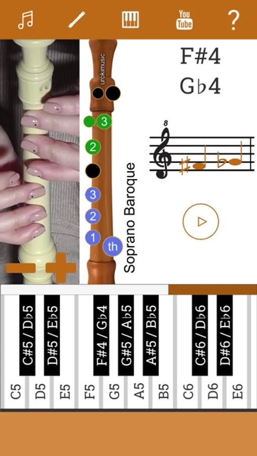Recorder Fingering Chart shows you the position of the fingers on the instrument. You can hear the sound of each musical note. There is a diagram of the finger positions and a demonstration by a live flutist, so you will learn how to play recorder. You can choose different types of recorder: sopranino, soprano, alto, tenor, bass. Baroque and German fingering.