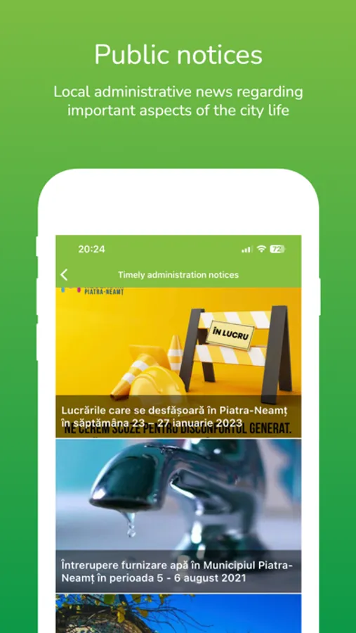 As a local, the app enables you to easily report different issues concerning your city to the local authorities. You can report problems you encounter on the public domain, traffic, public transport, and many more. The app also has a News section from Piatra Neamt City Hall.
