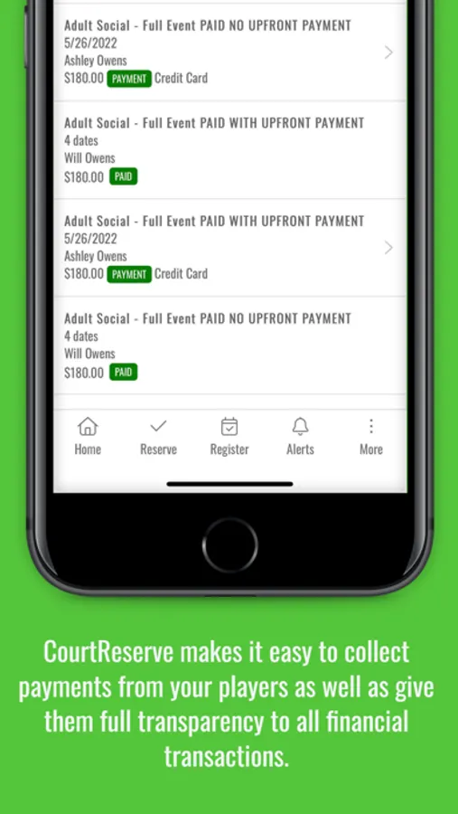 CourtReserve gives you the ability to get paid upfront to secure online bookings. With complete tracking of all your financials without having to hire expensive accountants, you can rest assured that you are staying in business and can grow your organization.