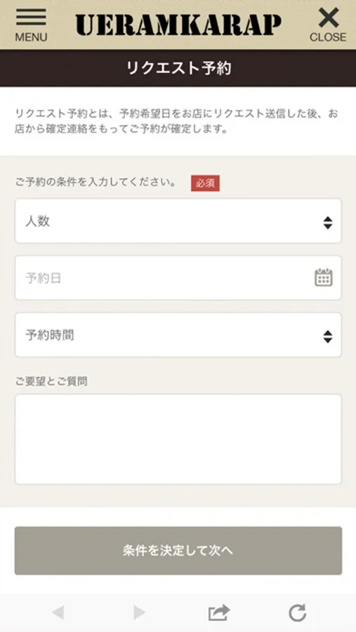 希望の人数・日時を指定して送信するだけで予約を依頼できます。