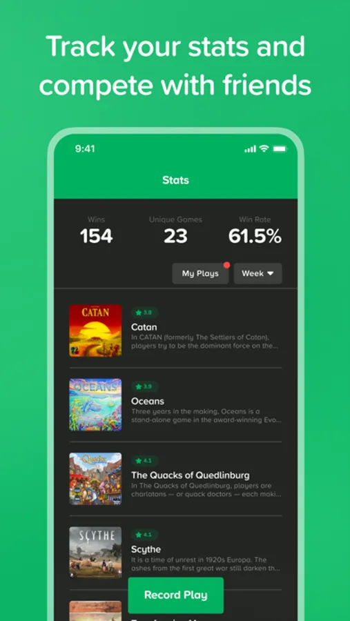 Cardboard Companion makes it easy to record your plays. If you’ve already been recording your plays elsewhere, don’t worry—you can effortlessly import your plays from several other stat tracking services. In stats, you’ll get to see your overall play stats change over time. You can also view per-game stats to see which of your friends is the unofficial champ of a certain game.