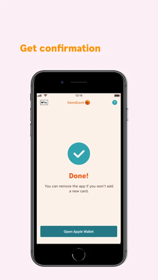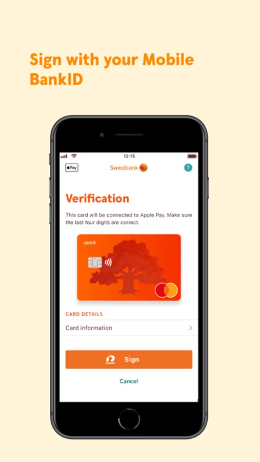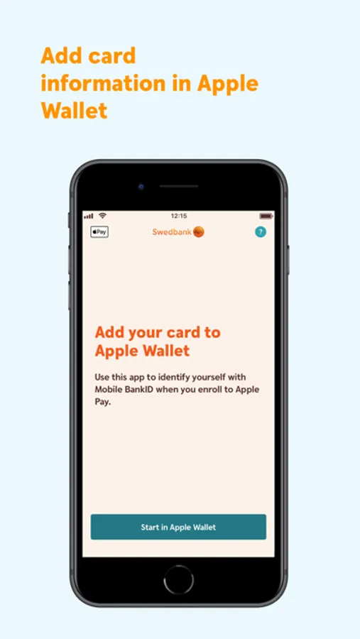 You can add a card from Swedbank to Apple Pay and identify yourself with Swedbank plånbok app and Mobile BankID. Add your card in Apple Wallet and then verify with Mobile BankID. When you have added your card, you can pay with Apple Pay through Apple Wallet.