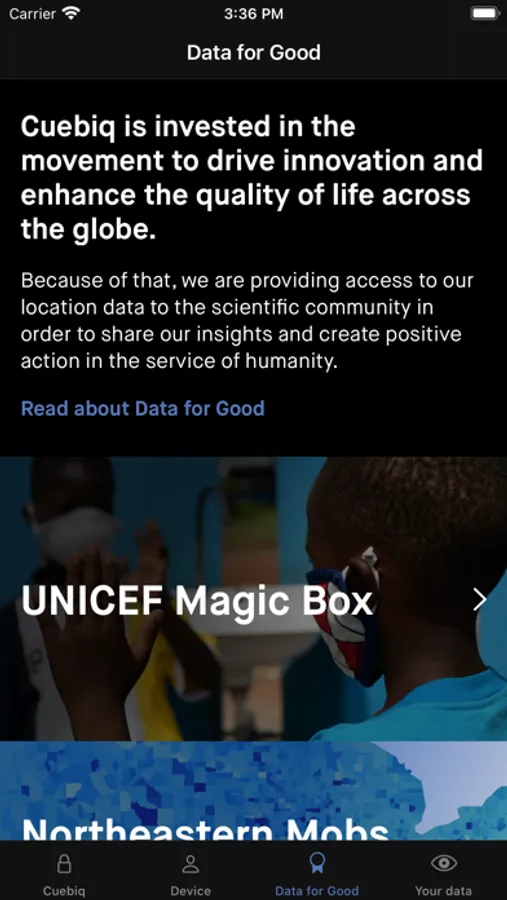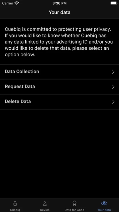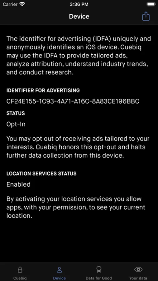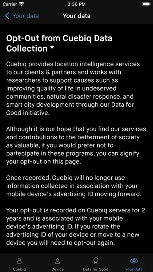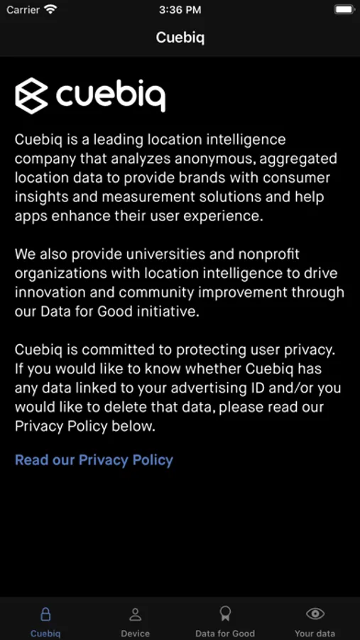 Do you want to know if Cuebiq has any data linked to your advertising ID? In an effort to be completely transparent with consumers, we’ve developed this app so you can determine if we’ve collected any data associated with your advertising ID and if so, delete that data. Please visit us at www.cuebiq.com to learn more about Cuebiq.