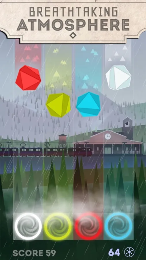 Through breathtaking atmosphere you try and catch falling, colored elements with intuitive one touch controls where you drag and re-order your base that results in a meditative but also challenging world.
