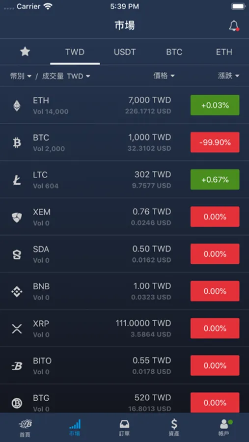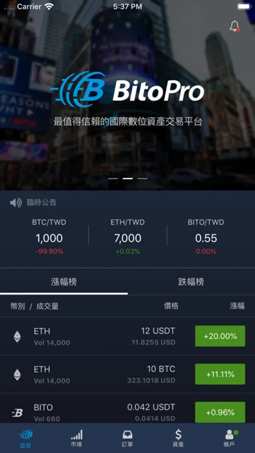 - Market Overview: A full view of all of BitoPro’s listed tokens and real time prices.