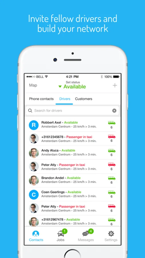 Our platform technology facilitates cooperation amongst independent drivers by helping them to join forces in private groups and together be successful in servicing customers in their local market. The free app enables you to connect with your network of drivers straight from your phone contact list. Within minutes you are able to see who’s available and dispatch your first jobs based on availability at the entered pickup location. The app registers all relevant information regarding pickup and drop-off times and actual route.