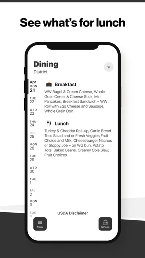 Within the dining section, you'll find an easy to navigate, weekly menu, sorted by day and meal type.