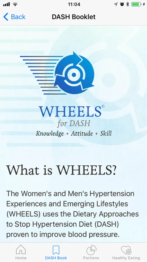 WHEELS for DASH VA is a mobile version of the "Women's and Men's Hypertension and Emerging Lifestyles Intervention" (WHEELS) for the Dietary Approaches to Stop Hypertension eating plan (DASH). WHEELS for DASH uses tailored messaging to teach and reinforce knowledge, attitudes and skills to maintain and build healthy eating patterns. Users must be enrolled as part of an Ann Arbor VA study to gain access.