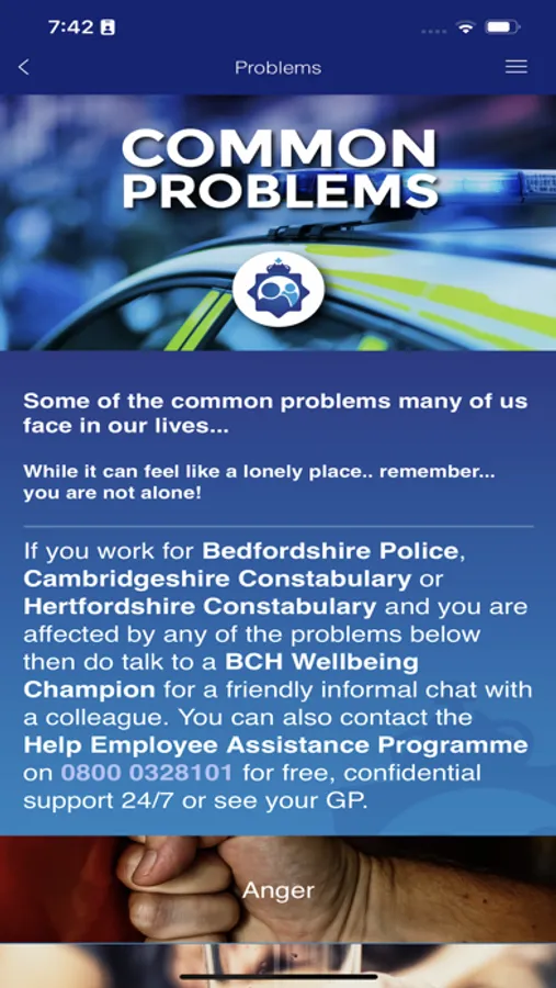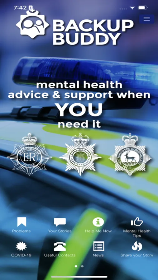 The Backup Buddy Police Support app is for police officers and staff in Bedfordshire, Cambridgeshire & Hertfordshire, designed to help with mental health issues.