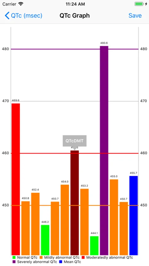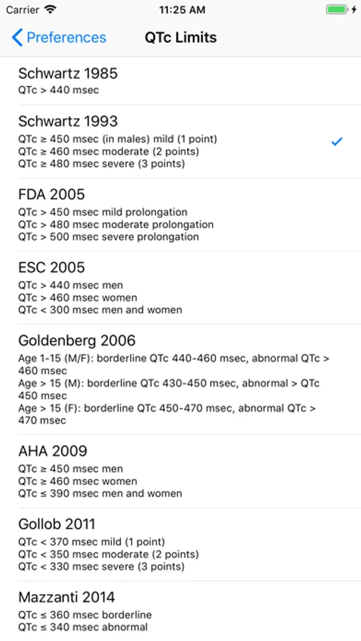 This app collects over 30 published formulas for calculating the corrected and predicted QT interval (QTc and QTp). Included are details on each formula and reference links. Results are analyzed statistically and graphed. Published definitions of normal and abnormal QTc intervals are also included.